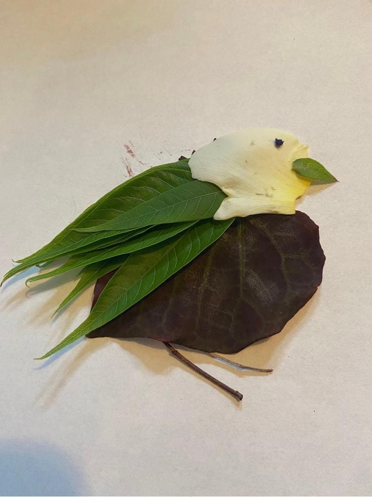 “For my reflection activity, I simply chose to step out to my porch. It overlooks a small garden in our front yard, and in our quiet neighborhood on a sunny day, it’s the perfect place to sit and think for a while. I brought a speaker outside, because music always helps to get the brain working. I sat on the ledge, feet dangling above the flowers and trees, and I did absolutely nothing for an hour and a half. It was a perfect way to clear my head and get in a better state of mind; the flowers smelled nice, there was a lovely breeze blowing through, and there were various birds chirping and bees buzzing around. As time went on, I began to look around for materials to construct a bird out of … All in all, this was a very calming exercise, and I would absolutely do it again. —Sam (Sam’s RadJoy Bird is pictured above)