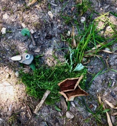 Gifts to earth: We offered prayers of gratitude; we offered water to the Earth; we made a Radical Joy Bird – for the first time – a bird made all natural materials except for one plastic eye.
