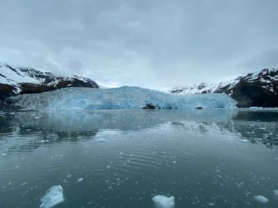When our ship’s captain shut down the engines and we began to drift in the freezing silence we were a mile or so away from the mile long face of the Holgate Glacier . The Holgate pours out of 700 square miles of the Harding Icefield. I was awed by the majesty of the white wall and the peak I had above the top ledge at the 78 mile long tail that went back between steep mountain slopes and up disappearing into a solid layer of smooth bottomed clouds.