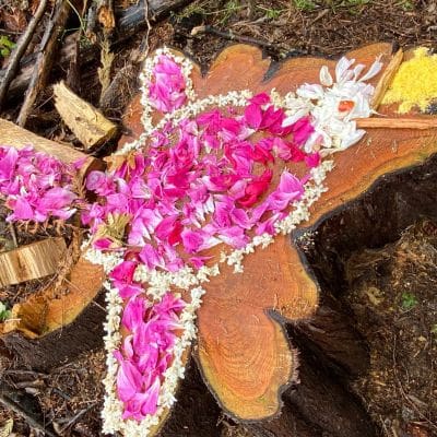 Then it hailed, truly it hailed: little balls of white jumping on our sleeves, messing with our hair, adorning our bird. We continue working rapidly as our wet backs begin feeling the chill, our hands are soaked, my fingers having a harder and harder time picking up the fragile petals. We flow, few words are needed. We trust each other’s choices. I experience the effervescent joy of co-creating. Though the complexities and paradoxes of our era remain, I imagine all of our hearts are feeling lighter as we head back to our cars.