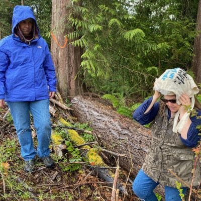Rain becomes a deluge – truly a torrent. Kathryn with no raincoat is drenched rapidly to the skin, but she joyfully shrugs it off. “As a kid, I used to love being out in the rain with no protection. Loved getting sopped. I’ll be ok…as long as we work quickly.”
