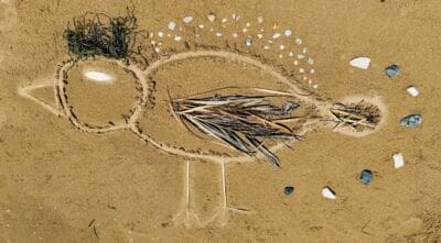 It was a collective vision for the art piece. We liked the idea of contributing to the tradition of a RadJoy bird and so we gathered elements from the sand and sea environment which we believed would represent a bird well. We intentionally placed seashells, seagrass, grains of wet and dry sand, stones, and reeds into the shape that we gently and temporarily outlined into this piece of the earth. It was enjoyable and enriching to make.