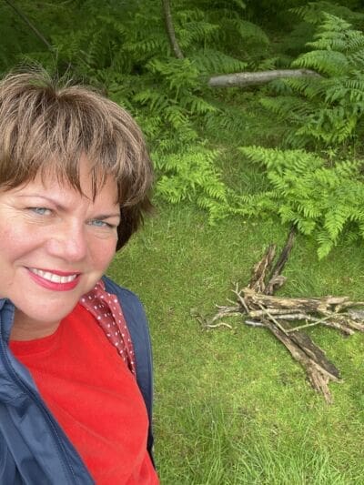 I began at the threshold of the woods by inviting the four cardinal directions to join me at this time. I walked slowly around familiar paths, touching fallen trees, speaking out loud to them. I was called to a particular place where I created a ceremony which included hanging wind chimes in the trees. I lit a candle and then slowly began to gather fallen branches and bark, slowly creating a bird. I then sat quietly honouring the trees and feeling a huge sense of gratitude for this beautiful place.