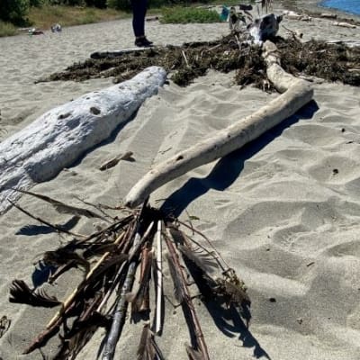 We abandoned our preconceived plans and looked around for what was at hand: driftwood, seaweed, more driftwood, more seaweed. Right in front of us was the head and undulating spine of a dragon. If we are to evolve as a species, we need dragon energy, big-winged, lightning bolt energy to help us transform our culture from one of domination and greed to a kinship world view. So we began embellishing that first log and lo, an hour later, here is what emerged. The Rad Joy bird transformed to a winged dragon. Along the way we found 35 feathers embedded in the sea weed. Not a good sign! We incorporated them in the tail and the spine.