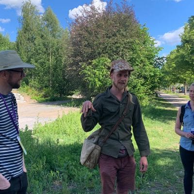 Next to the spot, Tuomas explained how there used to be a dumping ground next to the Iidesjärvi lake in the 20th Century. There has been major clean-up in the area, but the scenery still has the clear feel of a wounded place, and the lake still suffers from some poisonous waste. He also explained about the flora and fauna, and how the area is used for recreation purposes today. In the midst of the area, Panu introduced the principles of the Earth Exchange, and everyone had time to get to know the place by themselves as it is now. All 16 participants of the event walked around the multi-species environment. We witnessed a lot of various objects and organic material that had been carried to this wasteland, but also different plants and animals alive on the site.