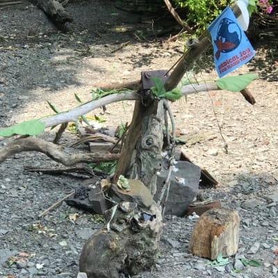 We talked about the climate catastrophe we are facing, and noted the murkiness of the stream that ran beside the path leading to the water. Then we spread out silently along the shore, gathering materials, both natural and manmade, that called to us. We collaboratively created our bird out of these materials, and then came back together in circle around our creation.