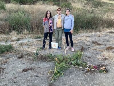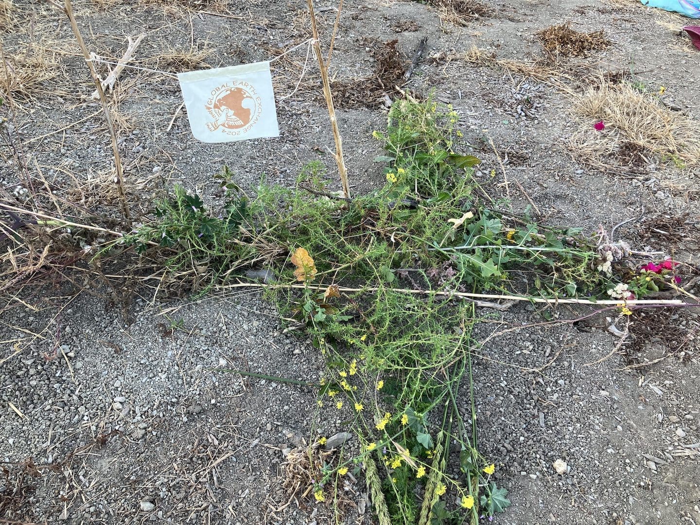 Our bird is barely recognizable, but we had fun making it. We found little garbage but much non-native plant material and a little native material (abundant so OK to harvest.) The bird is outlined with last year’s mustard stalks, and filled in with mustard, giant wild rye stems, tumbleweed, coast buckwheat, datura, and several varieties of thistle. The eye is opuntia cactus flowers and the beak is a pinecone.