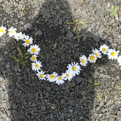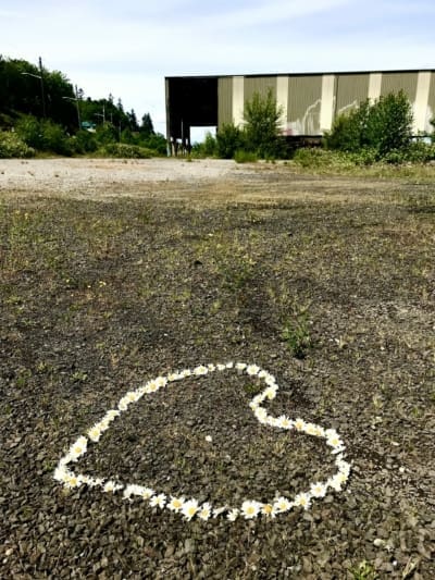 So I placed my daisies in the shape of a heart, out in the middle of the graveled field. Then I stood in the middle of the heart, closed my eyes, and envisioned a park here. I saw it with its soil cleaned of any hazardous waste, with grass and trees, local art sculptures and meandering walkways, and children and families playing. Then I photographed the beauty I had created, to share with you all. May those moments help to move this sweet spot on our dear Pachamama into a new direction for all of us Beings who call this place home.