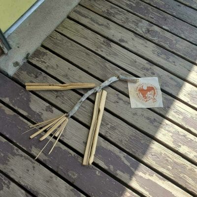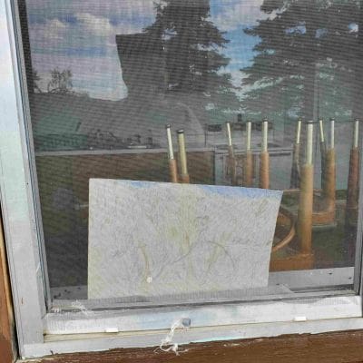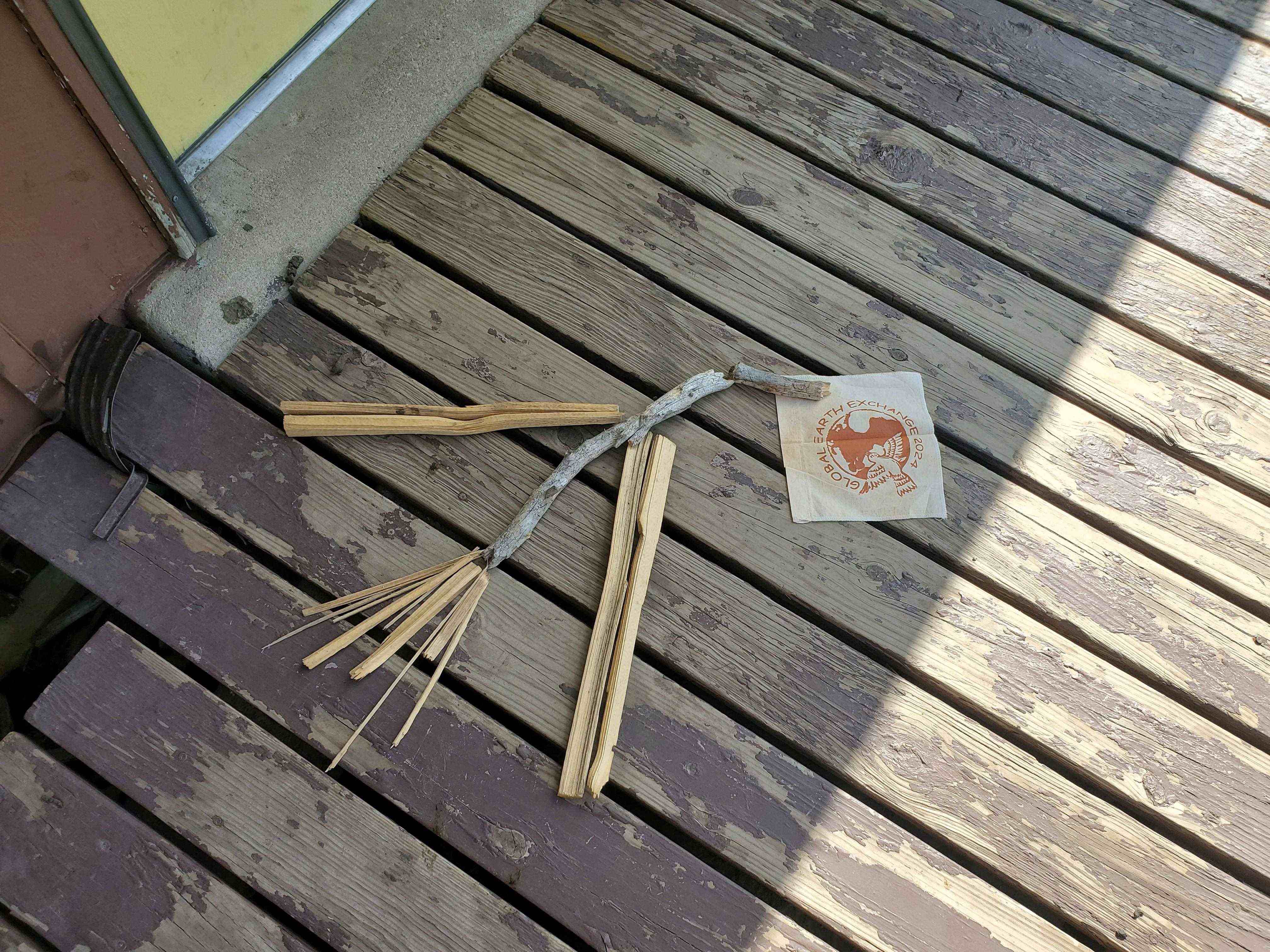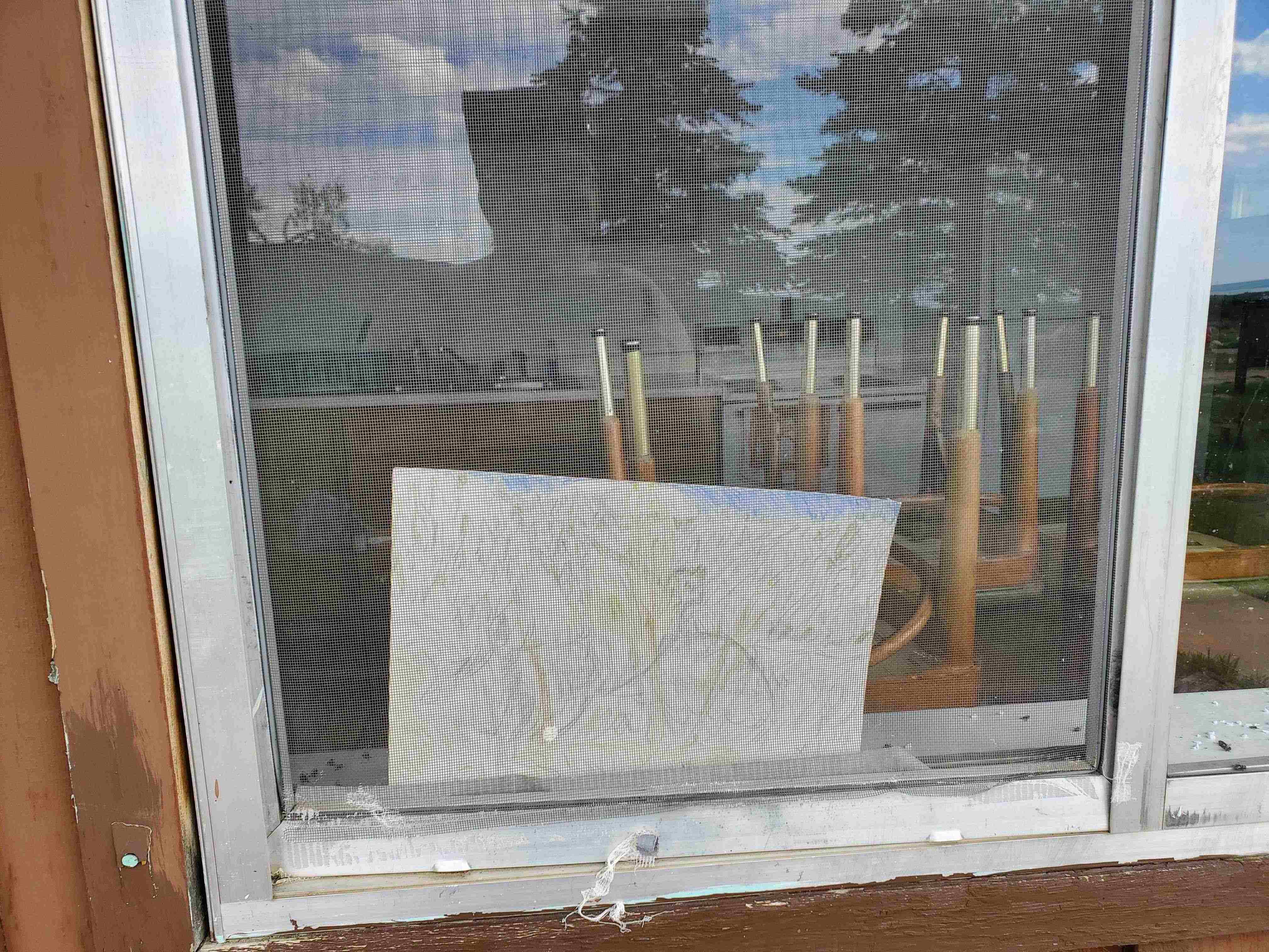 When I explored the ranger station, I discovered a pile of sticks by the door that wanted to be shaped into the RadJoy Bird. After I created it, I left it there as an offering. The flag I will tie to the top of a peace pole outside my home prayer flag style (Couldn’t set it up in time for a picture, sorry). I also drew the view of the Forest from behind the ranger station with the image of the RadJoy Bird within it. I tucked the drawing under a broken window screen as another offering.