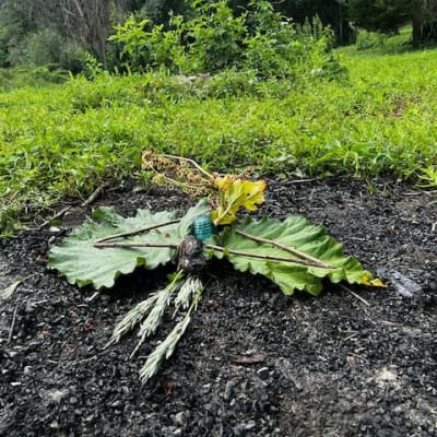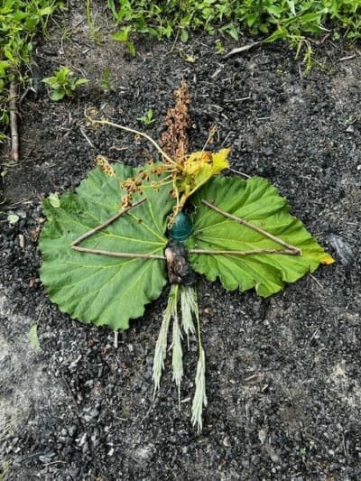 In Spirit and with mindfulness, Suzanne and I walked the land, gathering unusual inflorescences and found objects that spoke to us as we went along. We created an offering for the continued healing of Over Yonder – – a Phoenix rising out of the ashes, literally the ashes from a burn pile of invasive species we removed in spring. Seemed very fitting.