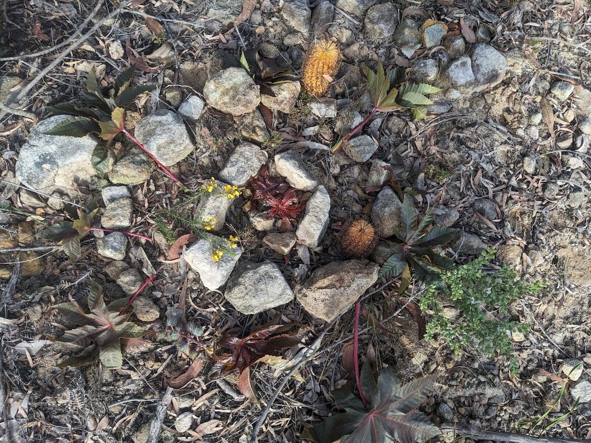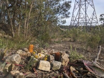 This is the site of a sandstone quarry that was due to be rewilded and given back to the wild river valley that it had occupied over its license. A group of neighbours bravely resisted, funded lawyers, submitted statements, signed petitions, attended council meetings, spoke up for the endangered wildlife, the wombats, the swamp wallabies and spotted quoll, who are residents of the valley. We lost this one and the sandstone continues to be taken out at an accelerated pace. We wanted to honour the fight, and speak beauty to the earth in this disturbed place.