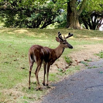 Each year we have returned to this location, we have seen improvements. This year, the area felt more cared for than ever. Hardly any trash was strewn over the land and rocks in the stream. The water looked clear, however there was definitely an industrial smell lingering in the air. We also saw how the kudzu that used was vining all over the trees had been hacked down. We could see the actual trees, not just their outline. We took time to contemplate and came back to share. Autumn noticed the large bridge that juts between the tree line and thought about how it looked like a huge dinosaur. This brought up the idea that if humans died off and anyone came back, they would see this monstrous remnant of the past breaking down. Lisa saw the rippling reflections of the water on the vegetation on the bank. It felt like nature’s disco – a cascading light show with the babbling water as music. Both were glad to see how the beauty of the area is continuing to be enhanced. The most amazing gift came as we left the park as we came upon a deer with fuzzy antlers nibbling along the asphalt path. It wasn’t phased by us at all. He took his time, grazing on park area, urban forest on one side and a sidewalk and roadway on the other.